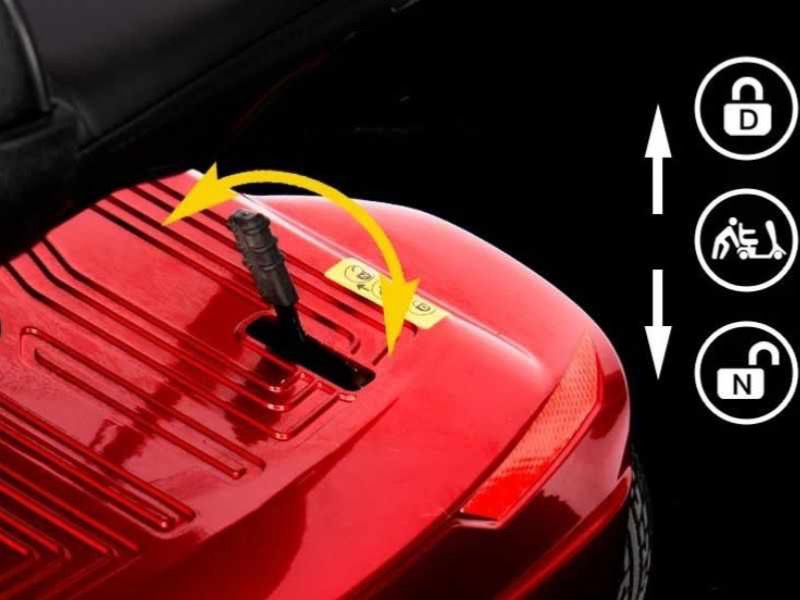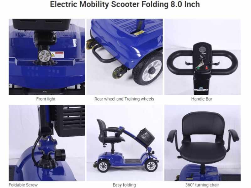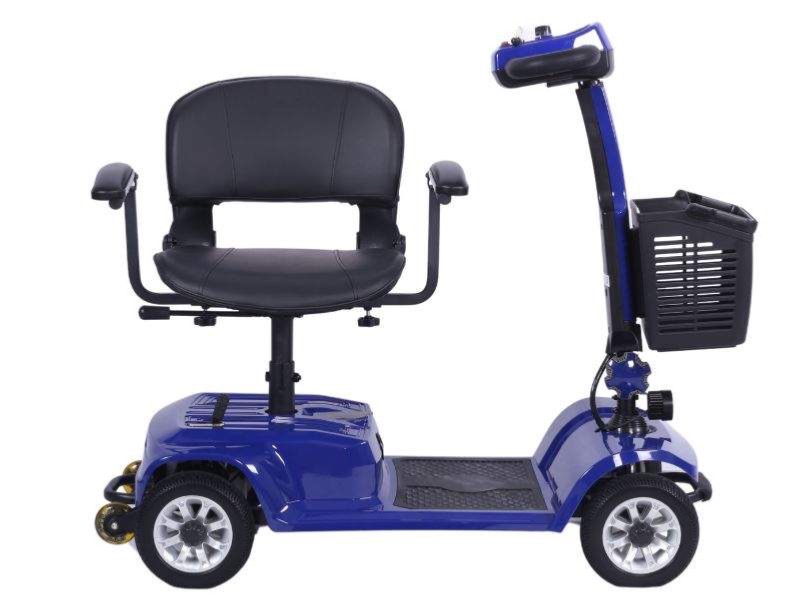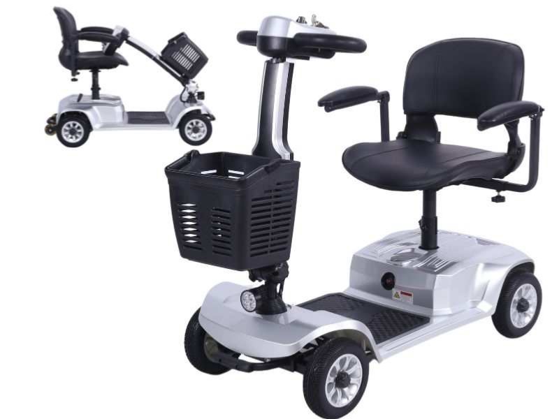 Scooter électrique pour personnes handicapées et à mobilité réduite. Pour un transport facile, le siège peut être retiré et le guidon rabattu. Equipé de roues solides, d'un panier de rangement et d'un siège pivotant à 360°.